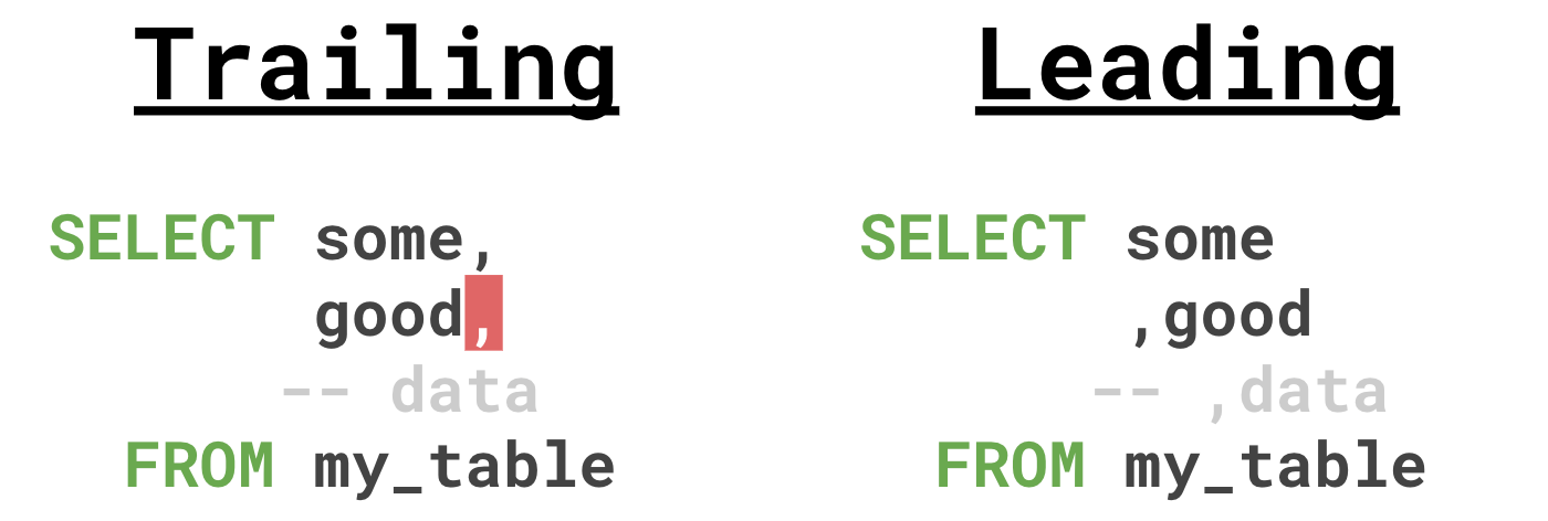 While leaders lead with leading commas, and trailing commas are leading signs of failing lines, and the tale aligns no matter the database breed, we’re not agreed that it’s best to concede to lead because the more we scale our query kneading, the more we follow the trail to trailing from leading.